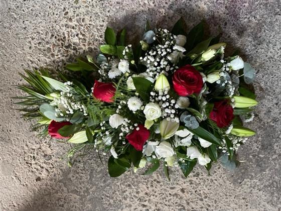 Classic mix of red roses and white lily in a single ended spray