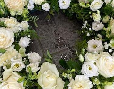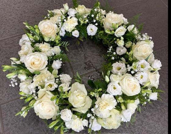 Beautiful mix of classic fresh whites and greens in an all round wreath design