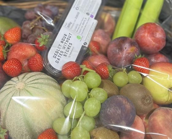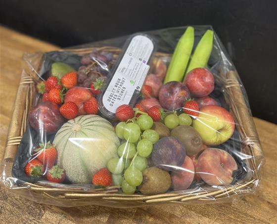 Lovely seasonal selection of fruit displayed in a lovely basket, add chocolates and wine if required