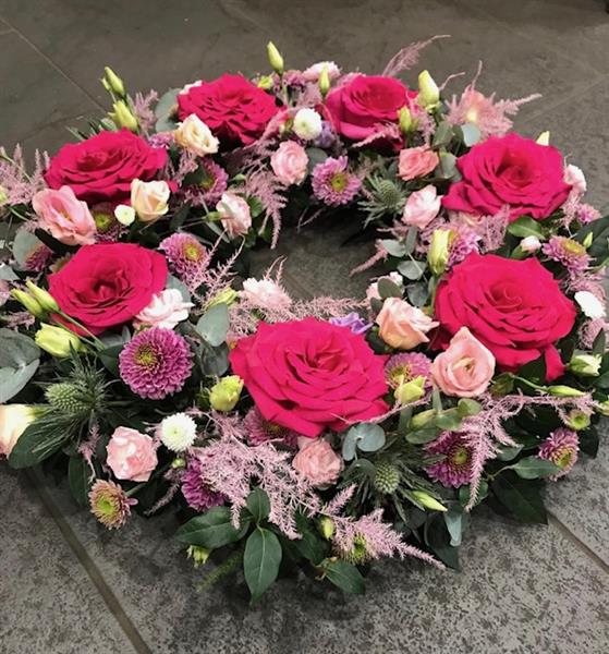 Stunning wreath made with beautiful garden style roses fresh rosemary and spray roses
