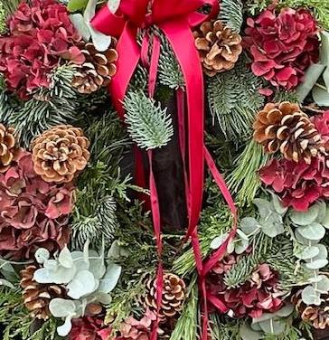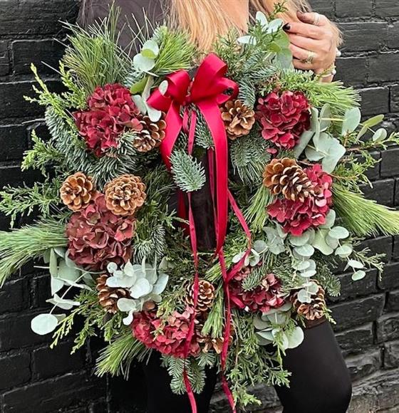 Stunning door wreath of mixed christmas foliages hydrangea and cones inspired by mulled wine colours