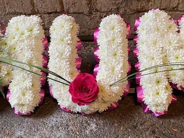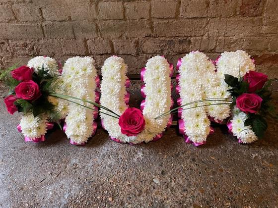 Mum based in white with pink ribbon edge and sprays, colours can be changed to your requests