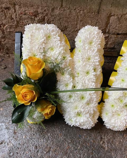 Nan based in white with yellow ribbon edge and sprays, other colours of ribbon and sprays can be requested at your choice