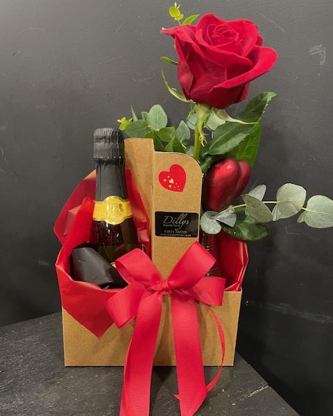 Get valentines off with a pop with a beautiful rose and mini prosecco in quirky carry box