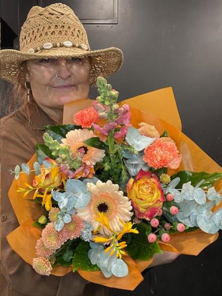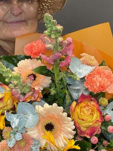 Inspired by beautiful autumn sunrises warming oranges and peach flowers in a lovely handtied bouquet