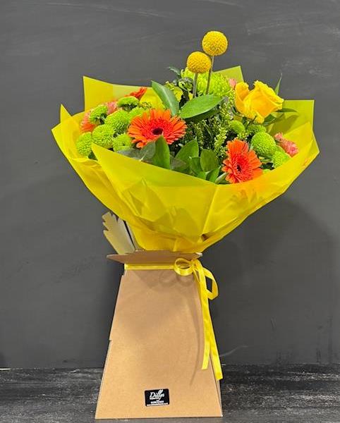 Sunny citrus coloured flowers in a aqua pack bouquet