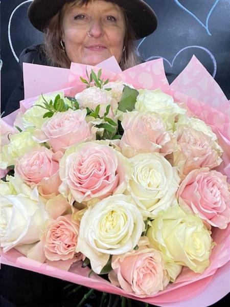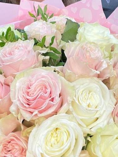 24 stunning blush pink and creamy white roses artfully arranged and packaged in water. Representing purity love and sincerity