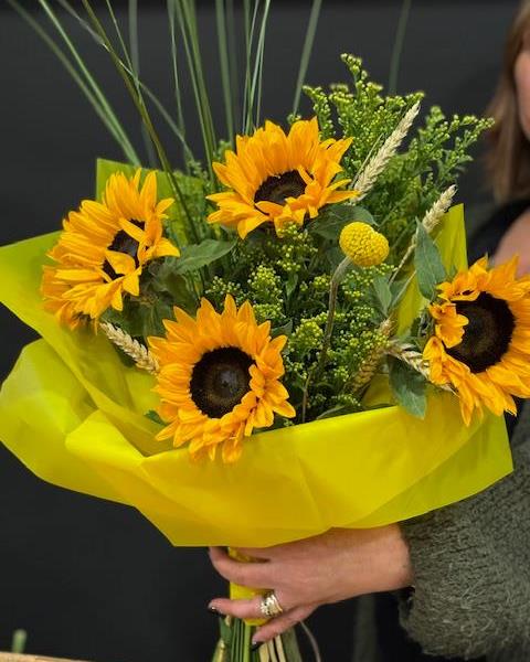 Super happy sunny sunflowers tied with foliage corn and grasses