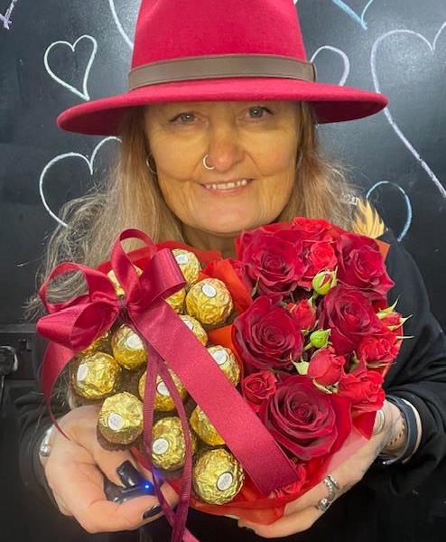 A chic hat box of decadent chocolates and stunning red roses where sweetness meets romance in the most elegant way